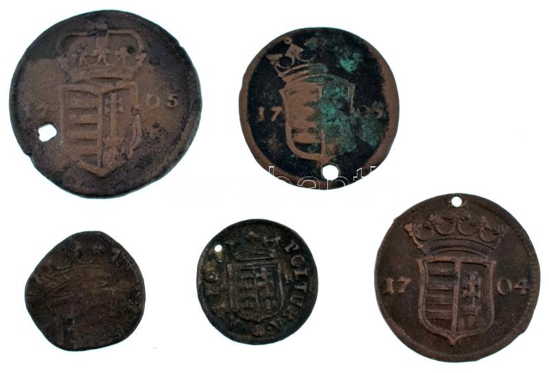 Leírás: Vegyes 5db-os rézpoltúra "II. Rákóczi Ferenc" lot, közte 1704. X Poltura (8,08g) + 1705PH XX Poltura (13,98g) T:XF-F 4db lyukasztott