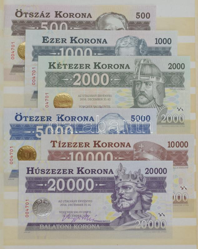 2012. 500 Balatoni Korona + 1000 Balatoni Korona + 2000 Balatoni Korona + 5000 Balatoni Korona + 10.000 Balatoni Korona + 20.000 Balatoni Korona mind azonos "004701" sorszámmal. Teljes sor! Mind a tervező, Vagyóczky Károly aláírásával! T:UNC Hungary 2012. 500 Balatoni Korona + 1000 Balatoni Korona + 2000 Balatoni Korona + 5000 Balatoni Korona + 10.000 Balatoni Korona + 20.000 Balatoni Korona all with the same "004701" serial numbers and with handwritten signature from the notes designer, Károly Vagyóczky C:UNC