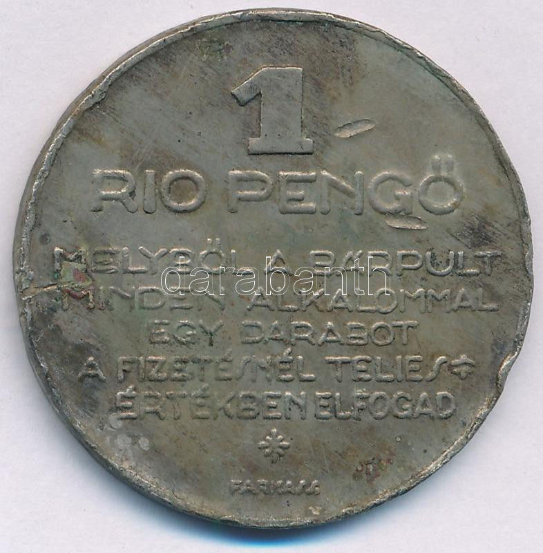 ~1930-1940. 1 Rio Pengő bronz bárca "MELYBŐL A BÁRPULT MINDEN ALKALOMMAL EGY DARABOT A FIZETÉSNÉL TELJES ÉRTÉKBEN ELFOGAD". Szign.: Farkas A. (Farkas Aladár?) (36mm) T:XF,VF több ph.