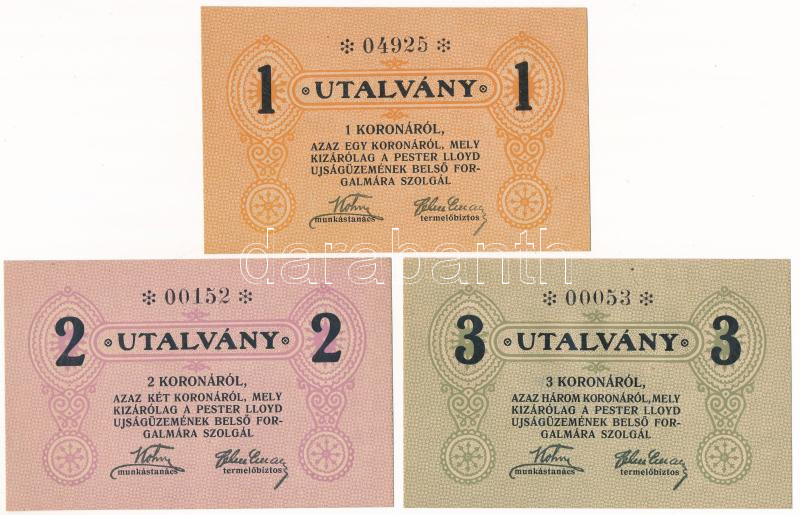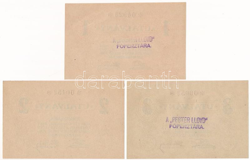 Budapest ~1920. 1K + 2K + 3K "Pester Lloyd" utalvány hátoldali bélyegzővel és anélkül T:UNC-XFHungary / Budapest ~1920. 1 Korona + 2 Korona + 3 Korona "Pester Lloyd" coupons backside with and without cancellation C:UNC-XF Adamo BUC-212.1,212.2.1, 212.3