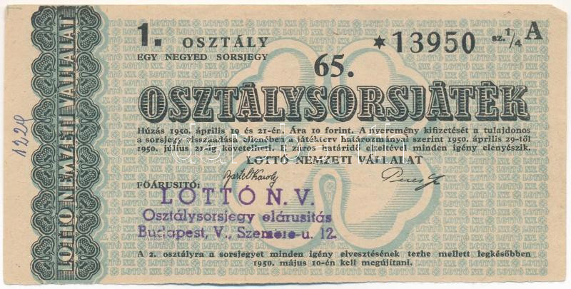 Leírás: Budapest 1950. "65. Osztálysorsjáték" 1. osztály 1/4 sorsjegy, "A"-sorozat T:F