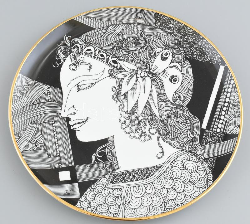Leírás: Hollóházi Szász Endre tervezte tányér, matricás, jelzett, hibátlan, d:24,5 cm