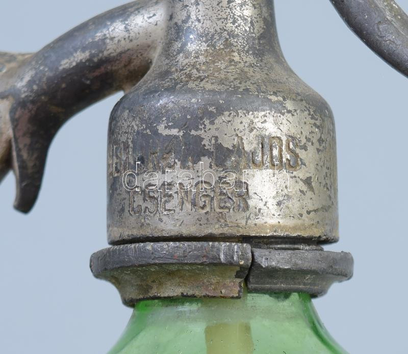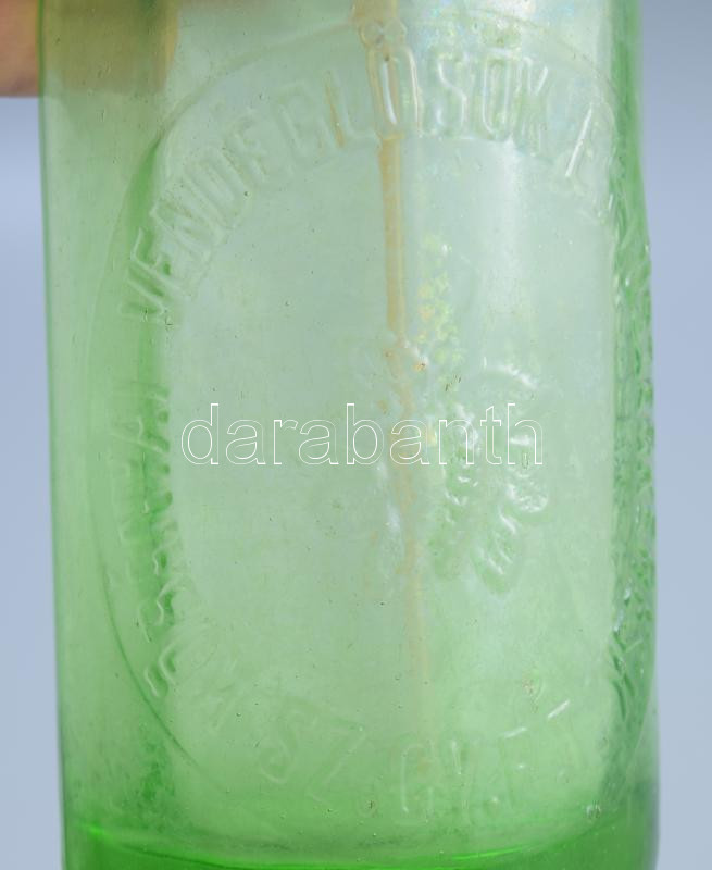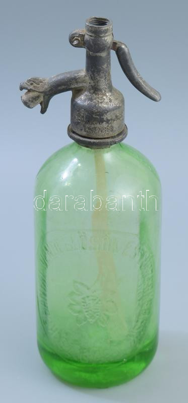 Leírás: cca 1930 Kőbányai Vendéglősök és Fűszerkeresk. Sz.GY.R.T. uránnal színezett szódásüveg, sascsőrös fejjel, m: 27 cm