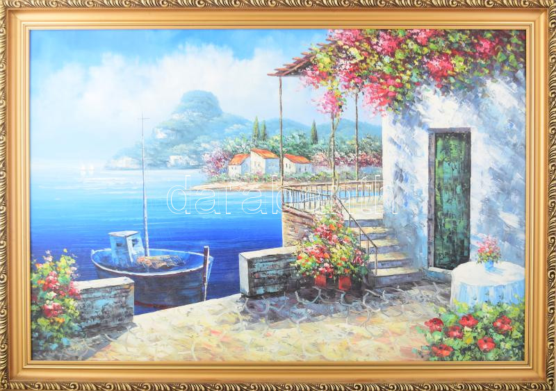 Olvashatatlan jelzéssel: Mediterrán részlet. Olaj, vászon, kartonon. 62x92 cm. Dekoratív fakeretben. KIZÁRÓLAG SZEMÉLYES ÁTVÉTEL, NEM POSTÁZZUK / ONLY PERSONAL COLLECTION IN OUR OFFICE!
