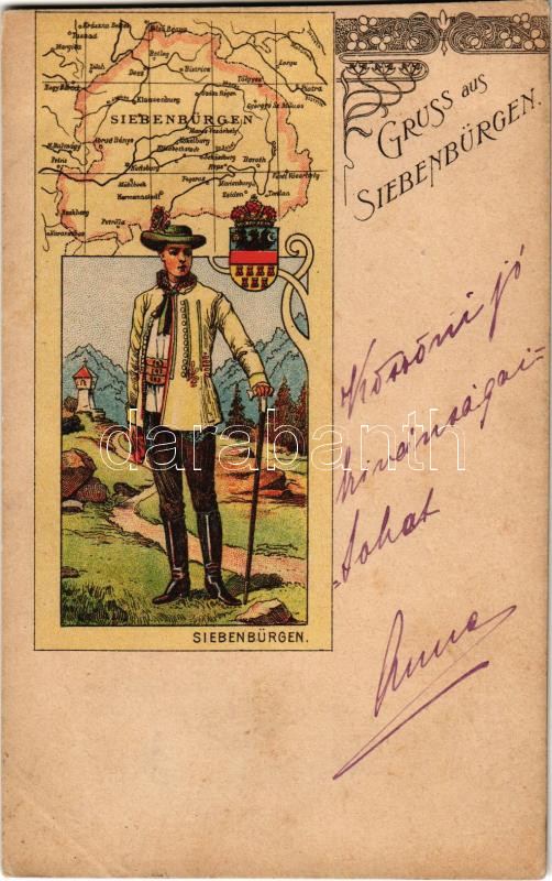 1899 (Vorläufer) Gruss aus Siebenbürgen! / Üdvözlet Erdélyből! szecessziós térkép népviselettel és címerrel / Greetings from Transylvania! Art Nouveau litho map with folklore and coat of arms