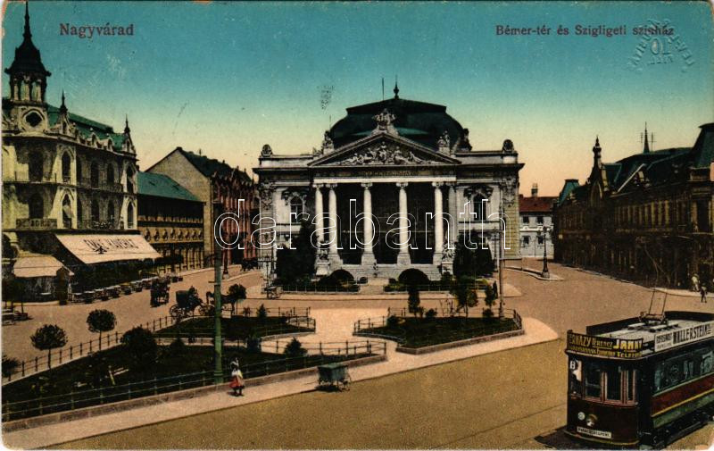 1915 Nagyvárad, Oradea; Bémer tér és Szigligeti színház, villamos reklámokkal, EMKE kávéház, Adria biztosító. Vasúti levelezőlapárusítás 55. sz. 1915. / square, theatre, tram with advertisements, café, insurance company (kopott sarkak / worn corners)