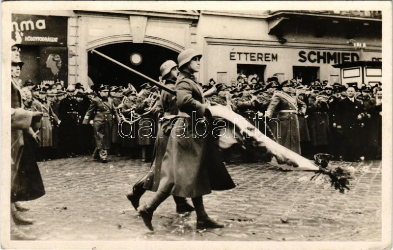 Leírás: 1938 Kassa, Kosice; bevonulás, Ludovikások díszmenete Magyarország Kormányzója (Horthy Miklós) előtt, Schmied étterem, hölgyfodrászat. Foto Ginzery S. 3. sz. / entry of the Hungarian troops, restaurant, hairdresser + "1938 Kassa visszatért" So. Stpl