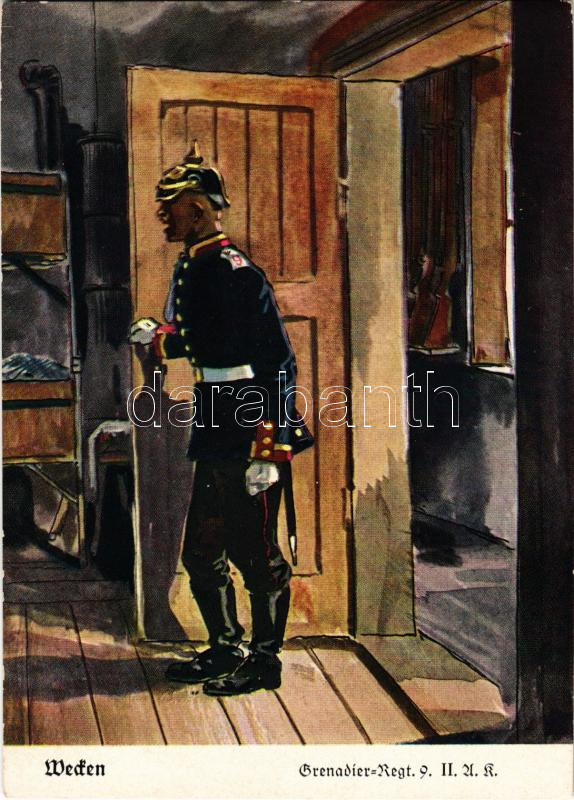 Wecken. Grenadier-Regt. 9. / German military art postcard https://www.darabanth.com/hu/478-Gyorsarveres/478.0/Kepeslapok/Katonai~1000049/Wecken-Grenadier-Regt-9-German-military-art-postcard~II3260294