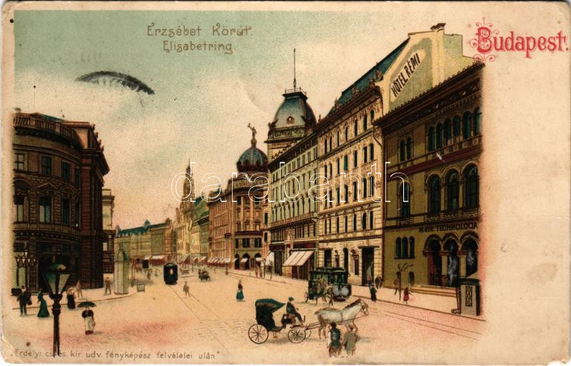 Leírás: 1899 (Vorläufer) Budapest VIII. Erzsébet körút, villamos, Hotel Rémi szálloda. Erdélyi cs. és kir. udvari fényképész felvételei után. litho (EM)