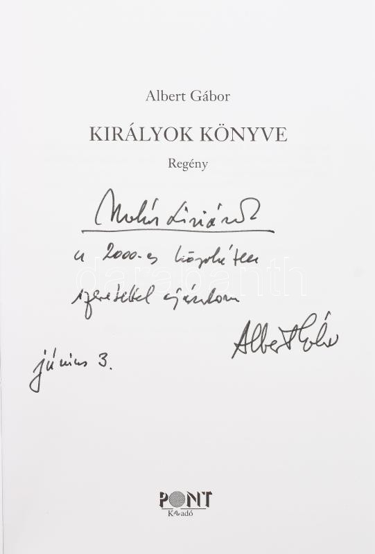 Albert Gábor: Királyok könyve. Regény. A szerző, Albert Gábor (1929-2017) író által Mohás Lívia (1928-2024) pszichológus, József Attila-díjas író részére DEDIKÁLT példány! Bp., 2000, Pont Kiadó. Kiadói kartonált papírkötés.