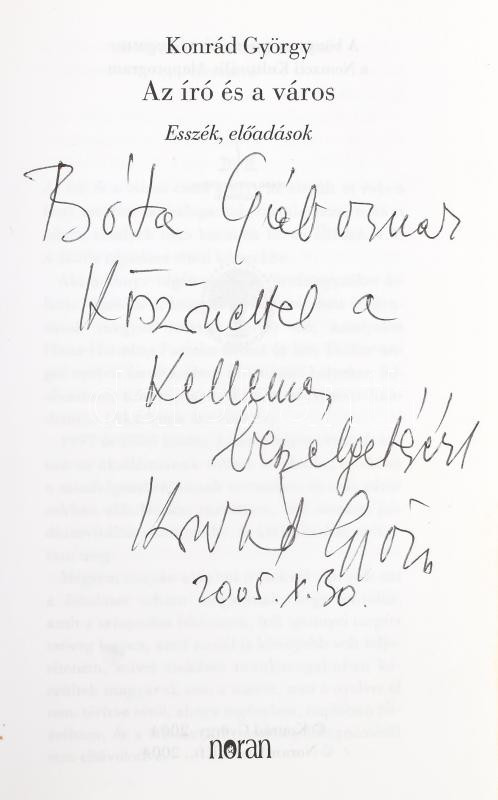 Leírás: Konrád György: Az író és a város. Esszék, előadások. DEDIKÁLT! [Bp.], 2004, Noran. Kiadói kartonált papírkötés, kiadói papír védőborítóban.