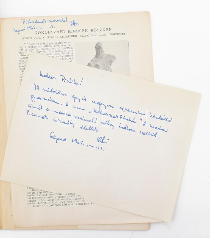 Trogmayer Ottó: Kőkorszaki kincsek Röszkén. A szerző Trogmayer Ottó (1934-2015) régész, muzeológus által Dienes István (1929-1995) régész, muzeológus részére DEDIKÁLT példány! Valamint a szerző, Trogmayer Ottó által Dienes István részére szóló levelével. Különlenyomat: Tiszatáj XIX. évf. 1965. június, kijáró lapokkal, sérült borítóval,455-458 p.