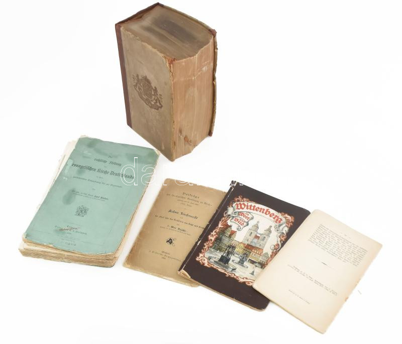 Sveriges rikes lag 1943. Karl Rieker: Die rechtliche Stellung der evangelischen Kirche Deutschlands in ihrer geschichtlichen Entwickelung bis zur Gegenwart 1893. D. Orthmann: Wittenberg in Wort und Bild 1925. Max Reischle: Sohms Kirchenrecht und der Streit über das Verhältnis von Recht und Kirche 1895. Folttal, sérült borítókkal.