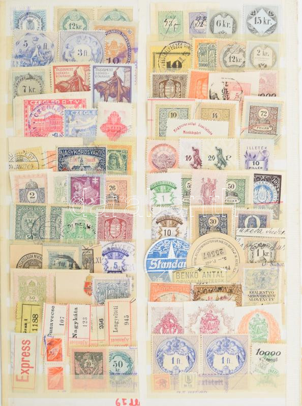 Leírás: 1870-1940 Okmánybélyeg gyűjtemény nagy címletekkel egy berakólapon némi parafilatéliával