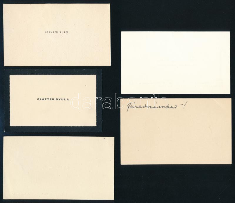 Leírás: Festők aláírt vagy autográf soraikkal ellátott névjegykártyája Kunwald Cézár, Olcsai-Kiss Zoltán, Bernáth Aurél, Glatter Gyula, Balló Ede