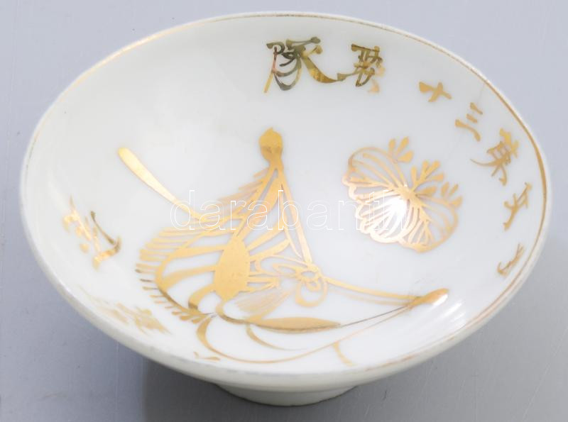 Japán porcelán katonai szakés csésze. cca 1940-1944, gyalogos hadosztály, páros zászló, császárfa levél és kalligrafikus díszítéssel, sérüléssel, d: 8 cm