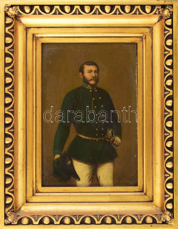 Katonai tisztviselő portréja, XIX. sz. második fele. Olaj, karton, jelzés nélkül, hátoldalán nem idevágó feliratokkal. Dekoratív, antik fakeretben. 28x18 cm