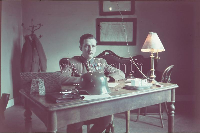 Leírás: cca 1940 M. kir. katonatiszt az íróasztalánál, rohamsisakkal, Agfacolor diapozitív, 3,5×3,5 cm