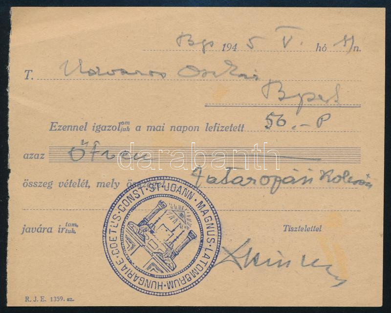 Leírás: 1945 Szabadkőműves befizetési nyugta, szép bélyegzéssel