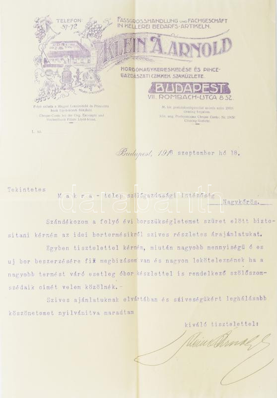 1916 Klein Arnold hordókereskedés fejléces céges levélpapír https://www.darabanth.com/hu/478-Gyorsarveres/478.0/Mutargy-papirregiseg-egyeb/Reklam~283/1916-Klein-Arnold-hordokereskedes-fejleces-ceges-levelpapir~II3262211