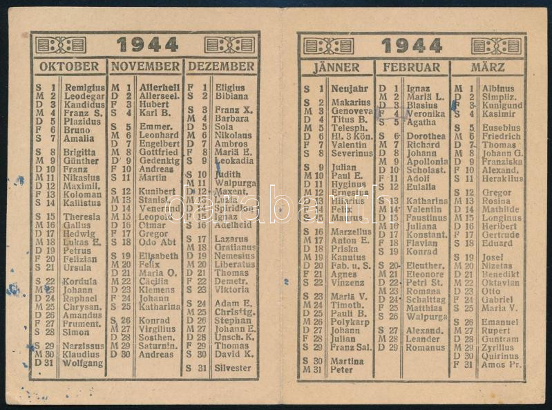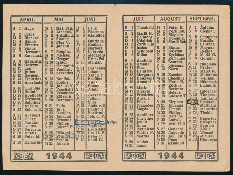 1944 Kártyanaptár kis tollas bejegyzéssel kihajtható https://www.darabanth.com/hu/478-Gyorsarveres/478.0/Mutargy-papirregiseg-egyeb/Reklam~283/1944-Kartyanaptar-kis-tollas-bejegyzessel-kihajthato~II3243324
