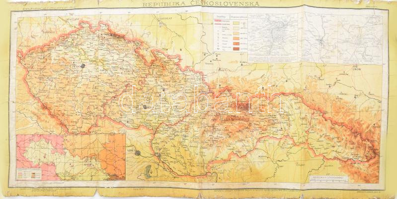 Leírás: A Csehszlovák Köztársaság térképe, 1:1 500 000, vászontérkép, sérülésekkel, 32×64 cm