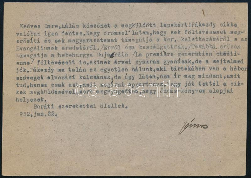 1952 Kodolányi János (1899-1969) Kossuth-díjas író, újságíró gépelt levele, Szabó Imre (1904-1958) könyvkiadó, szerkesztő, az Exodus Könyvkiadó egykori vezetője részére, Kodolányi autográf aláírásával.