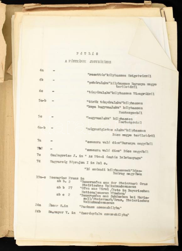1973 Bírálat S. Cserey Éva: XV-XVII. századi későközépkori szemeskályhák Magyarországon c. disszertációjáról. A fényképeket készítette: Sárdy Lóránt. 6 gépelt oldal + 23 képtábla. Sérült papírborítóban.