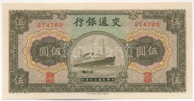 Leírás: Kína 1941. 5Y "Bank of Communications" T:UNC