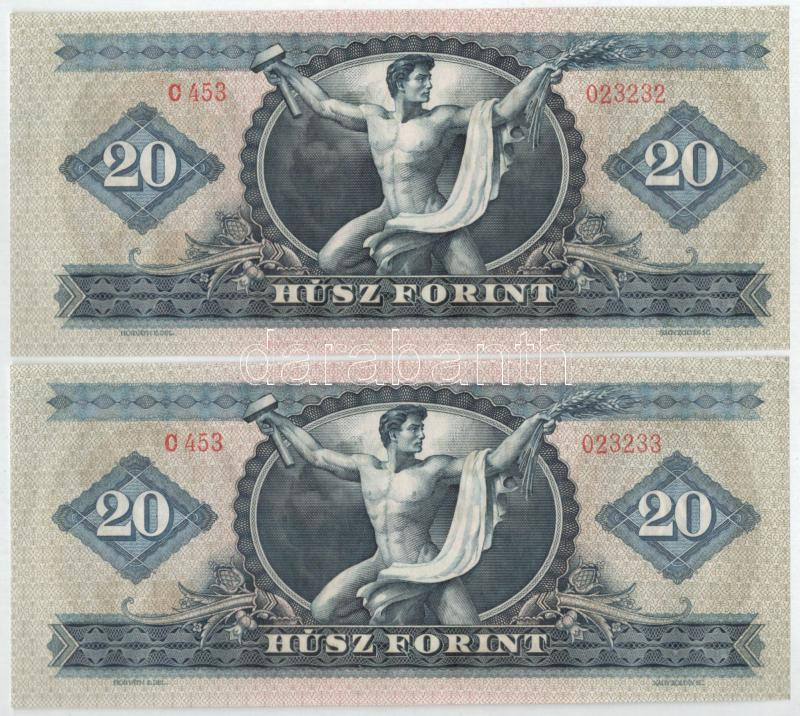 Leírás: 1969. 20Ft (2x) sorszámkövetők " C 453 023232 - C 453 023233" eltolódott nyomat T:AU hullámos papír Adamo F15
