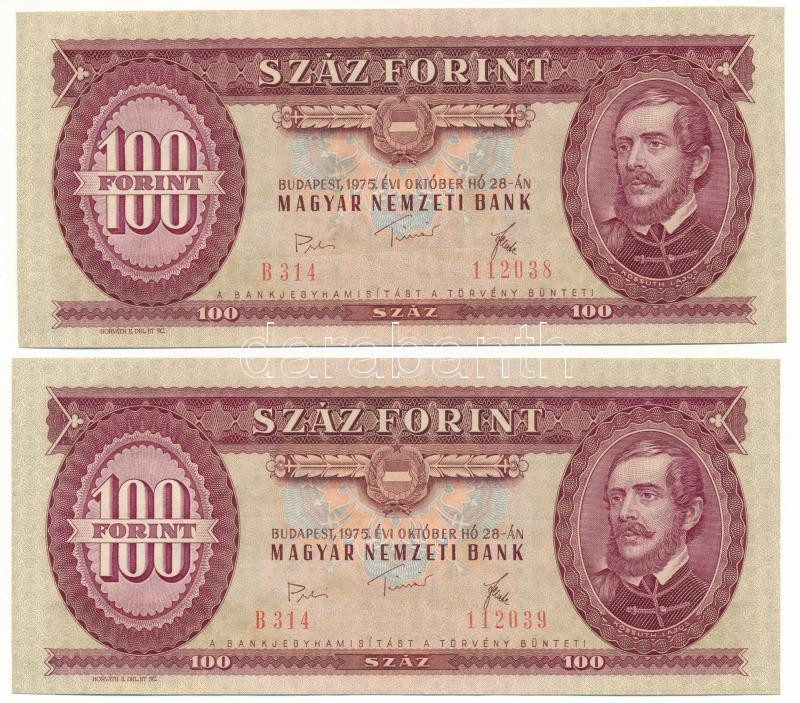 1975. 100Ft (2x) sorszámkövetők "B 315 112038 - B 315 112039" T:UNC hu... https://www.darabanth.com/hu/478-Gyorsarveres/478.0/Numizmatika/Magyar-bankjegyek~2000008/1975-100Ft-2x-sorszamkovetok-B-315-112038-B-315-112039-T-UNC-hullamos-papir-Adamo-F33~II3261602