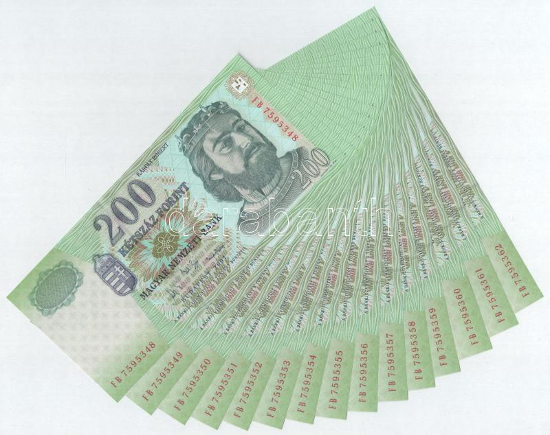 2007. 200Ft (15x) sorszámkövetők "FB 7595348 - FB 7595362" T:UNC,AU https://www.darabanth.com/hu/478-Gyorsarveres/478.0/Numizmatika/Magyar-bankjegyek~2000008/2007-200Ft-15x-sorszamkovetok-FB-7595348-FB-7595362-T-UNC-AU~II3232258