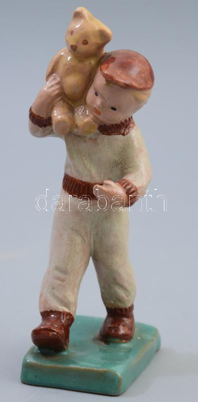Leírás: Macival játszó gyermek, mázas kerámia, jelzett, m: 15 cm