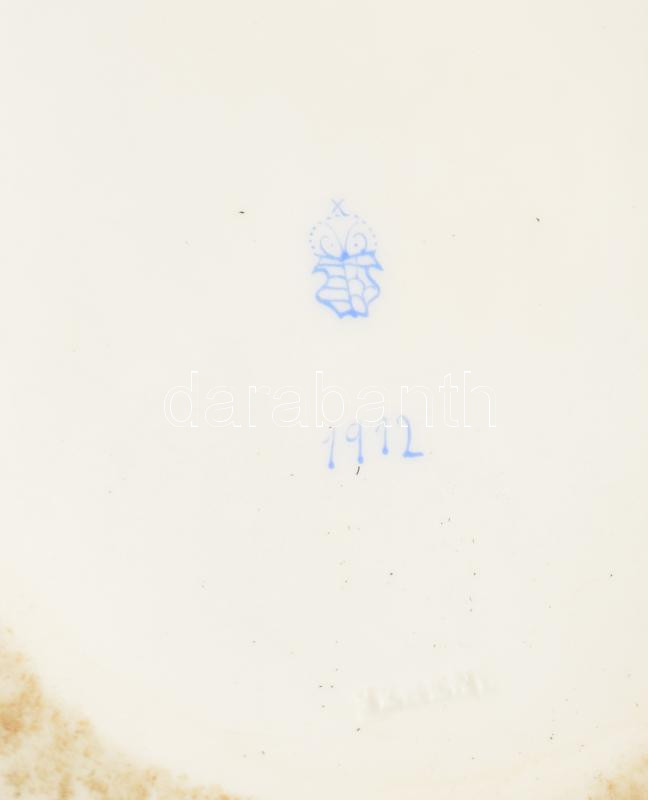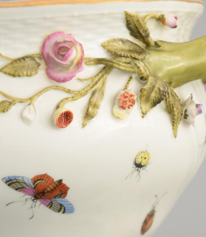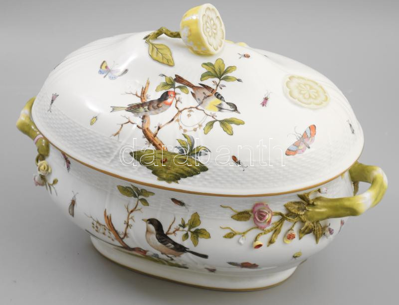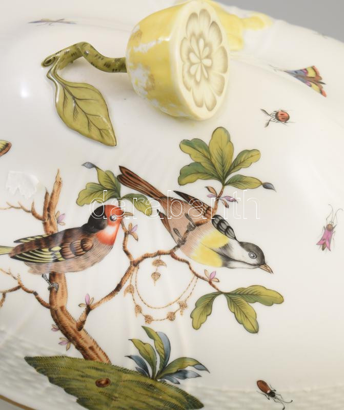 Herendi Rotschhild mintás nagy leveses tál. Plasztikus virág díszítésekkel. Kézzel festett jelzett, kopással, a virágon apró lepattanással. sz: 36 cm m: 25 cm