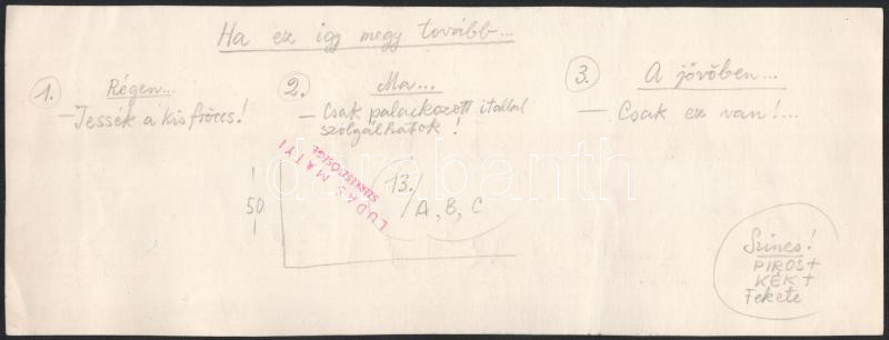 Szegő Gizi (1902-1985): "Ha ez így megy tovább.." (karikatúra). Vegyes technika, papír, jelzett és hátoldalán "Ludas Matyi szerkesztősége" bélyegzővel. 11x30 cm.