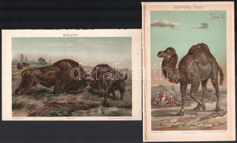 cca 1900 Egzotikus állatok, 2 db litográfia: 'Egypúpú Teve, és 'Bölény', Pallas Nagy Lexikona, Bp., Posner-ny.,a széleken a képet nem érintő sérülésekkel és hiányokkal, 13x20 cm