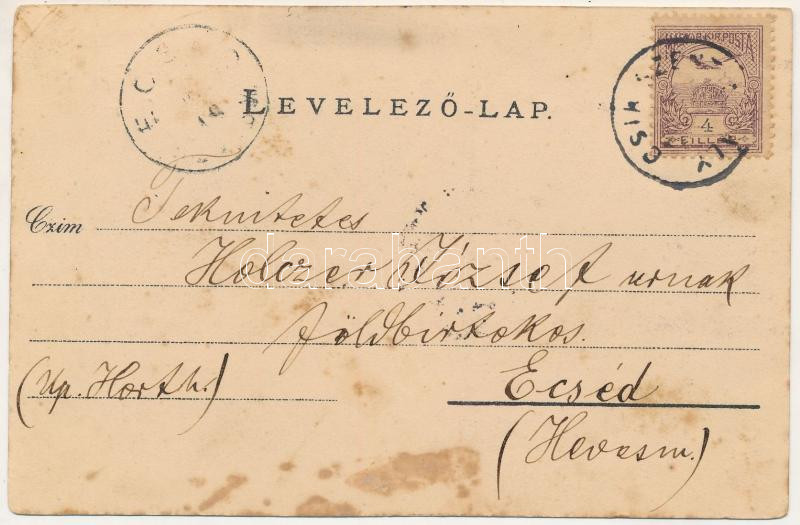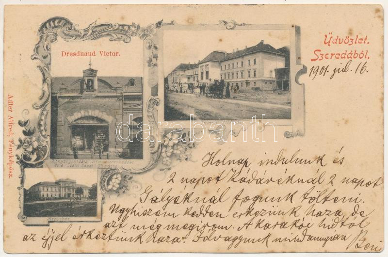 Leírás: 1901 Csíkszereda, Mercurea Ciuc; Csíkgyimesi vasútállomás, Dresdnaud Victor könyvnyomdája, könyvkereskedése és a "Csíki Lapok" kiadója, Megyeháza. Adler Alfred fényképész / Ghimes railway station, publishing house, county hall. Art Nouveau, floral (fl)