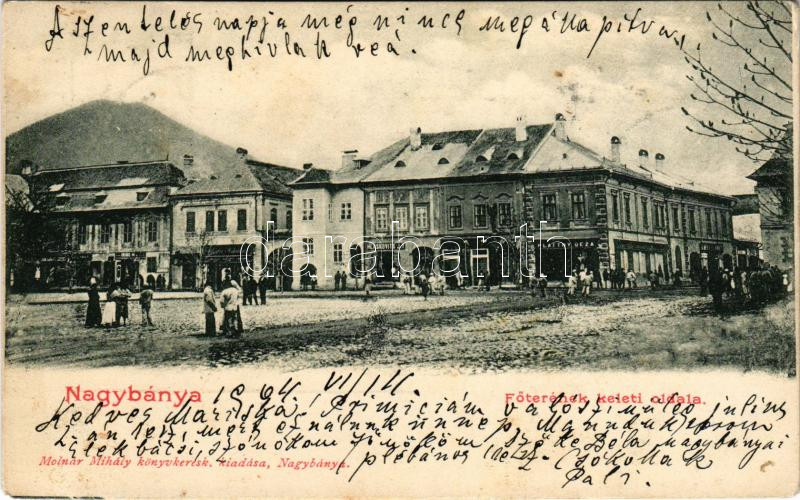Leírás: 1904 Nagybánya, Baia Mare; Fő tér keleti oldala, Herskovits J. T., Platthy Géza üzlete, piac. Molnár Mihály kiadása / main square, shops, market (EK)