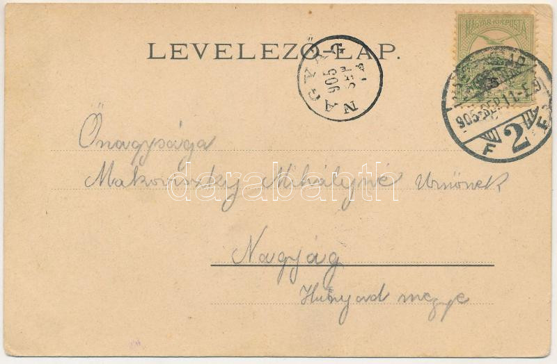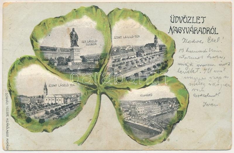 1905 Nagyvárad, Oradea; Szent László tér és szobor, piac, Kishídfő. Színházi tőzsde kiadása, szecessziós lóherés montázs / square, statue, market, bridge. Art Nouveau litho montage with clover (EB)