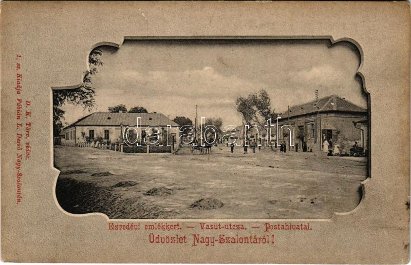 Nagyszalonta, Salonta; Ezredévi emlékkert, Vasút utca, Postahivatal. Fábián L. Dezső kiadása / Hungarian Millennium memorial garden, street view, post office (EK)