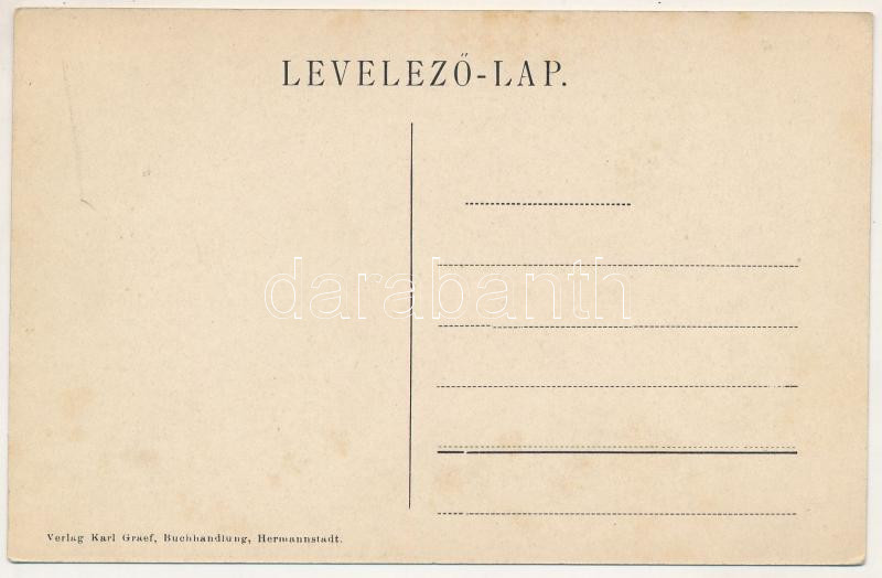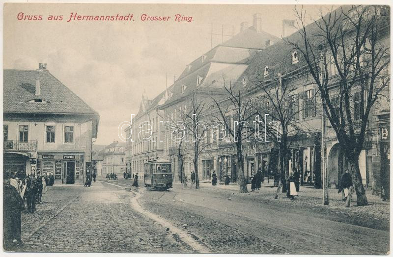 Nagyszeben, Hermannstadt, Sibiu; Grosser Ring / Nagy piac, villamos, Ludwig Fuchs, Karl Graef üzlete és saját kiadása / market square, tram, publisher's shop (EK)