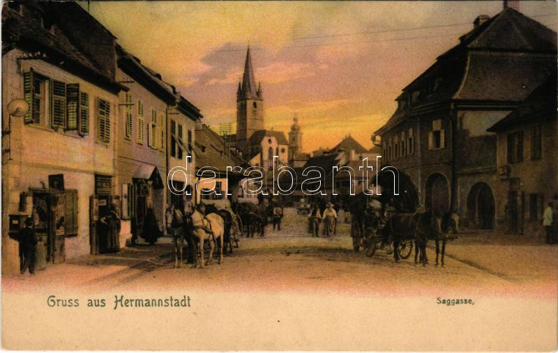 Leírás: Nagyszeben, Hermannstadt, Sibiu; Saggasse / utca, Hans Müller üzlete. Georg Meyer kiadása / street view, shops