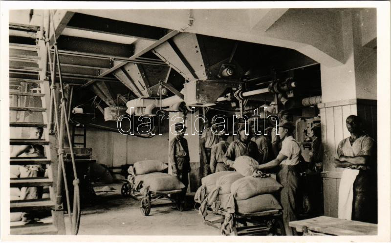 Aknaszlatina, Slatinské Doly, Szolotvino, Solotvyno (Máramaros); sómalom, belső, munkások zsákolás közben / salt mine, salt mill, interior with workers