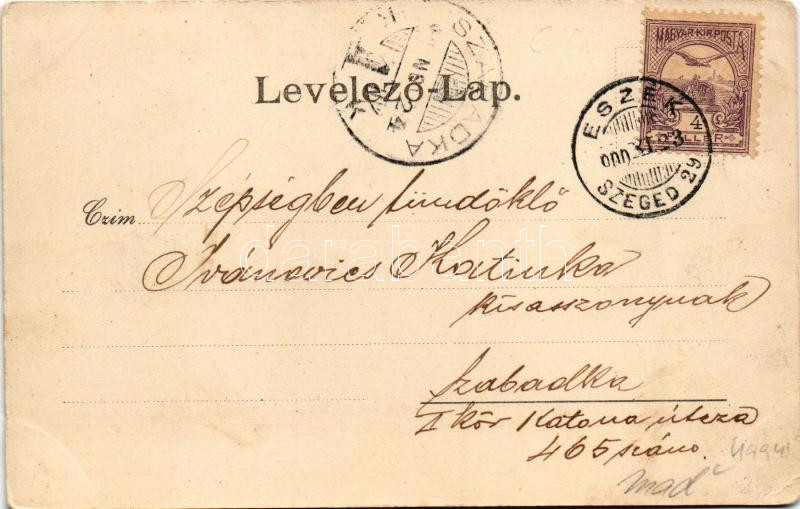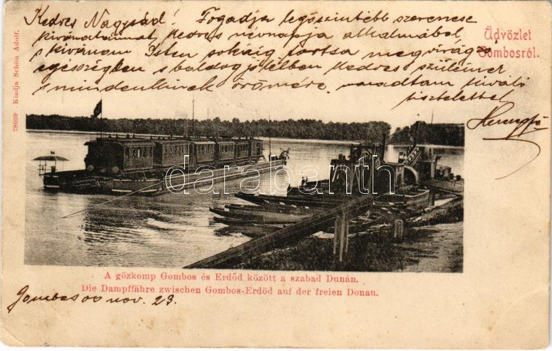 1900 Gombos, Bogojeva; Gőzkomp Gombos és Erdőd között a szabad Dunán, gőzmozdony, vonat. Schön Adolf kiadása / steam ferry with locomotive between Bogojevo and Erdut, train + "ESZÉK - SZEGED 29" vasúti mozgóposta bélyegző (EK)