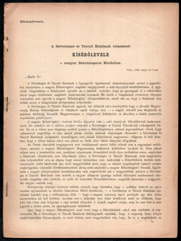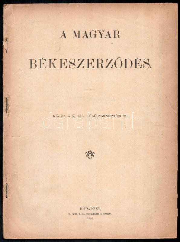 A magyar békeszerződés. Kiadja a M. Kir. Külügyminisztérium. Bp., 1920, M. Kir. Tud.-egyetemi Nyomda, 86 p. Tűzve, hiányzó borítóval, sérült, a tűzéstől különvált címlappal, régi intézményi bélyegzőkkel (A Képviselőház Könyvtára, 1926.)