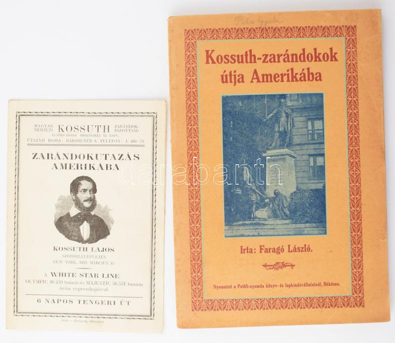 Faragó László: Kossuth-zarándokok útja Amerikába. Békés, 1928, Petőfi-ny. Fekete-fehér fotókkal illusztrált. Kiadói papírkötés. + 1928 Kossuth a New York-i Kossuth szobor leleplezési ünnepségének prospektusával.
