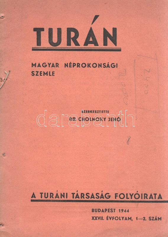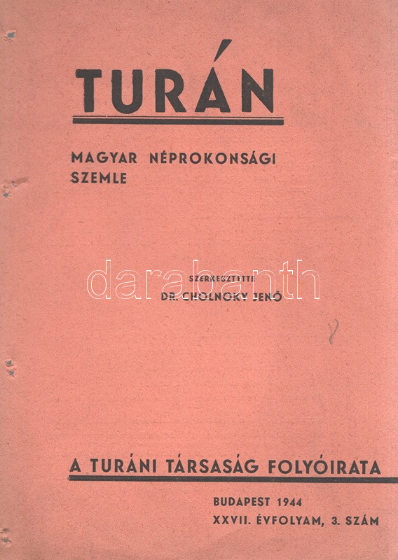 [Folyóirat] Turán. Magyar néprokonsági szemle. A Turáni Társaság folyóirata. XXVII. évfolyam, 1-2. és 3. szám. [Teljes évfolyam, két füzetben.] Budapest, 1944. (,,Élet" Irodalmi és Nyomda Rt.) 32 p.; 43-56 p. A Turán az 1910-ben alapított Turáni Társaság folyóirata. A korabeli turanizmus igen heterogén törekvéseket takar, ám elmondható, hogy alapvetően a germán, újlatin, szláv birodalmak korában a rokontalanul maradt népek kapcsolatait kereste a turáni (urál-altáji) nyelvészeti és kulturális rokonság jelszava mentén. Jóllehet a folyóirat egyes tanulmányai olykor a japán-magyar, török-magyar kulturális rokonság feltételezéséig is merészkedtek, a folyóirat profilja mégis elsősorban finnugrisztikai - a nyelvészeti szempontból rokonnak tartott kisebb finnugor népek, nemzetek, országok aktuális híreiről, kulturális eredményeiről és politikai törekvéseiről nyújt beszámolót. A Turán folyóirat érdeklődése ennek megfelelően elsősorban nem őstörténeti jellegű, sokkal inkább a bemutatott finnugor és törökségi népek néprajzi és kulturális kapcsolódásait kutatja és erősíti meg, illetve a kulturális rokonság folyamatos deklarálásával egy időben geopolitikai és gazdasági szövetségeseket is keres. A turanizmus tehát nem pusztán őstörténeti, néprajzi és kultúrelméleti célokat jelentett, hanem diplomáciai stratégiákat és gazdasági célokat is kijelölt: nem véletlen, hogy a Társaság székhelye az Országházban volt található. Évfolyamunk a Turán folyóirat utolsó évfolyama: az 1913-ban indult periodika az 1944. évi 3. lapszámmal megszűnt, szerkesztősége szétszéledt, turáni szemlélete folytathatatlannak, finnugor szemlélete pedig a Szovjetunió ügyeibe való beavatkozásnak minősült volna 1945 után. A tartalomból: Cholnoky Jenő: Üdvözlet a dicső török nemzethez - Steinwalter Károly: Merre állott Attila palotája? - Faragó József: Valamo, Finnország szent szigete. A háborús évben turáni témájú kritikai rovatnak nem maradt hely, helyére a magyar nemzeti katonaeszményt szolgáló mű megírására felhívó pályázat került, a társasági hírek rövidek. Az évfolyam harmadik füzete ritka, terjedelméből Cholnoky Jenő ,,A kínai és az európai műveltség érintkezése" címmel írt tanulmánya hiányzik, fűzése pedig meggyengült. Egységes, fűzött, enyhén elszíneződött, sérült kiadói borítóban. Az összevont lapszám első fedőborítóján kézi számítás.