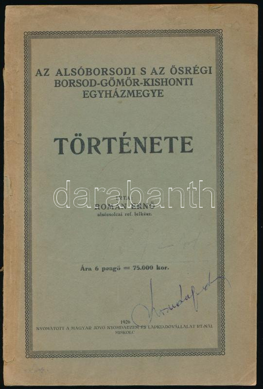 Román Ernő: Az alsóborsodi s az ősrégi Borsod-Gömör-Kishonti egyházmegye története. Miskolc, 1926, Magyar Jövő-ny., 175+(1) p. Egyetlen kiadás. Kiadói papírkötés, sérült borítóval és gerinccel, néhány kissé sérült lappal, a borítón névbejegyzéssel. (Ritka!)