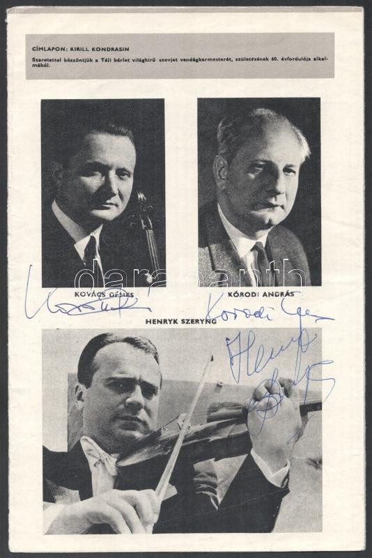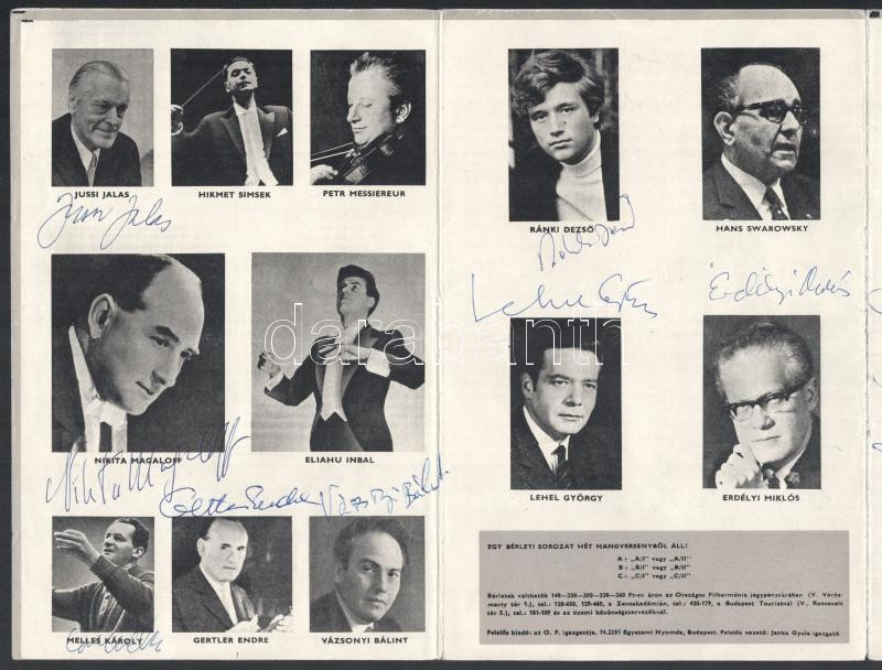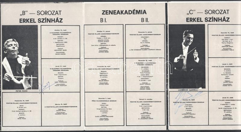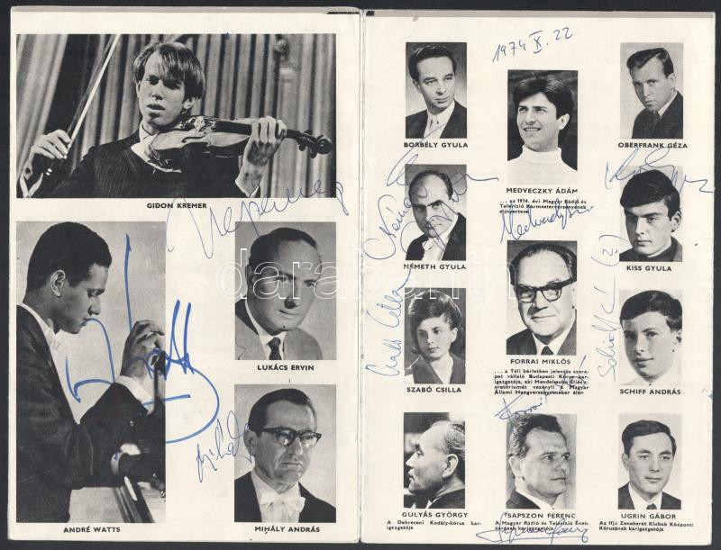 Ránki Dezső, Lehel György, Medveczky Ádám, Schiff András, Kóródi András, Gidon Kremer, Mihály András, Lamberto Gardelli és más neves zenészek össz. 23 db autográf aláírása a Téli Bérlet 1974-75 c, nyomtatványban
