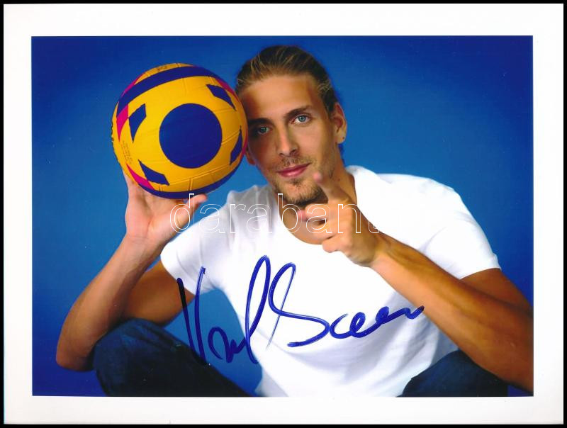 Leírás: Vogel Soma (1997-) válogatott vízilabdázó aláírása az őt ábrázoló fotón
